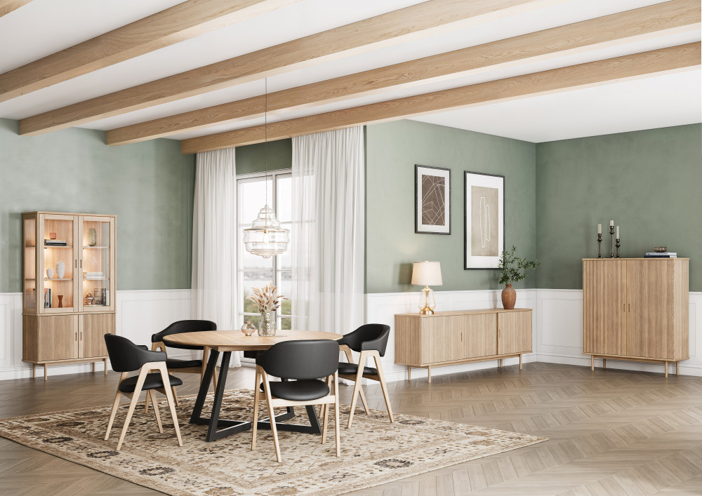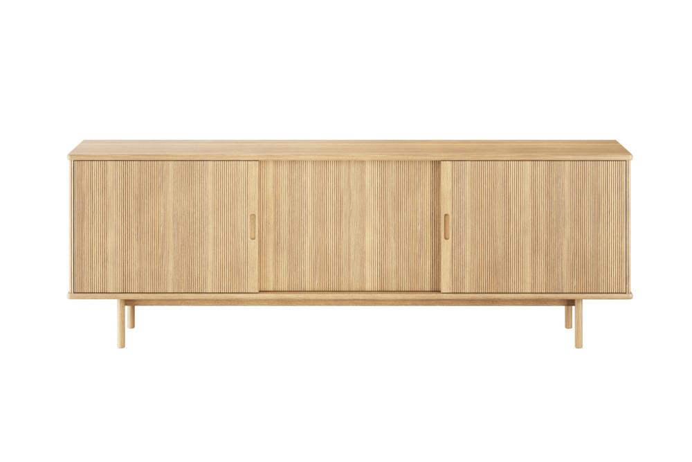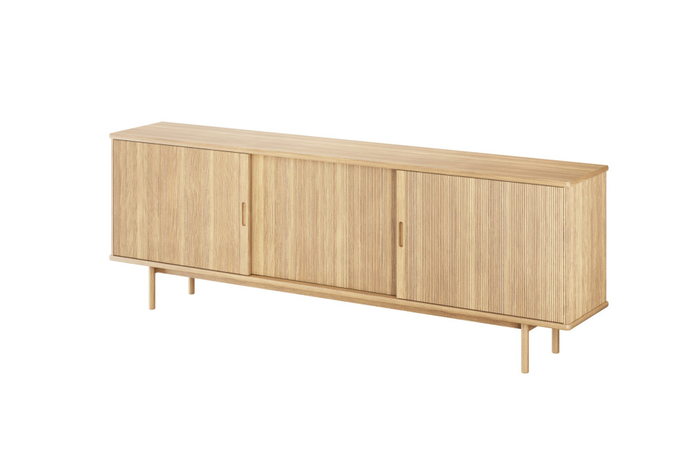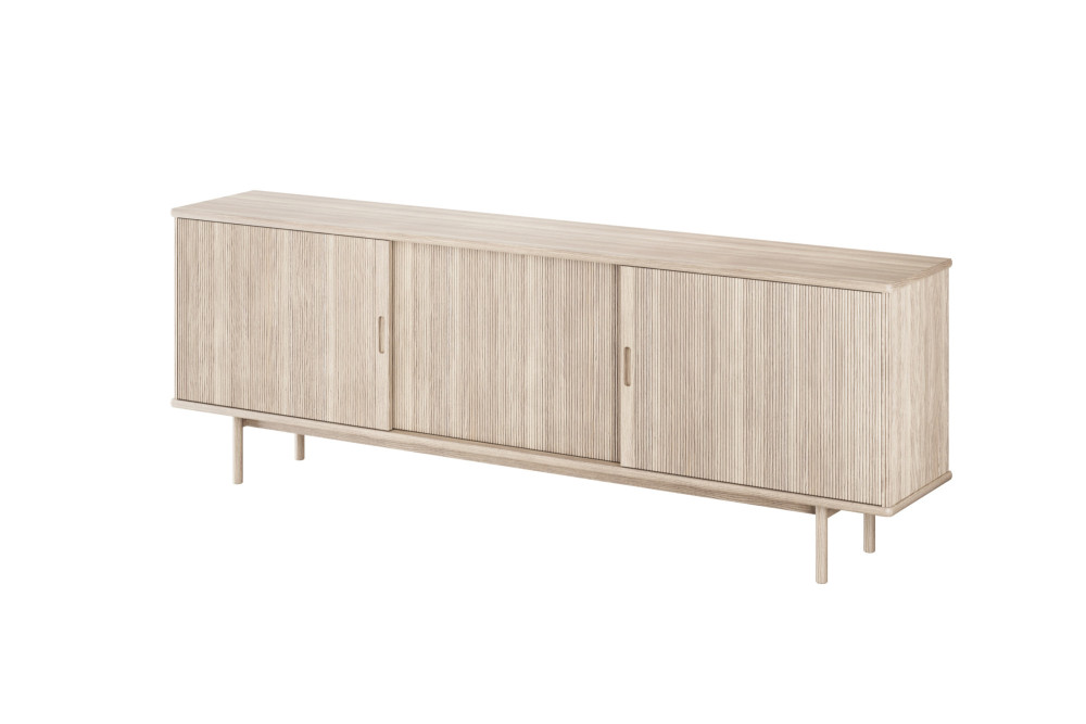Mööbliese on valmistatud tammespoonist ning selle täispuidust uksed tagavad vastupidavuse ja ajatu kvaliteedi, mida hinnatakse aastaid. Kolm täispuidust soonitud esipaneelidega liugust loovad kauni ja liikuva visuaalse efekti ning peidavad enda taga avara hoiuruumi. Reguleeritava kõrgusega riiulid võimaldavad kapi sisemust paindlikult vastavalt vajadusele kohandada.