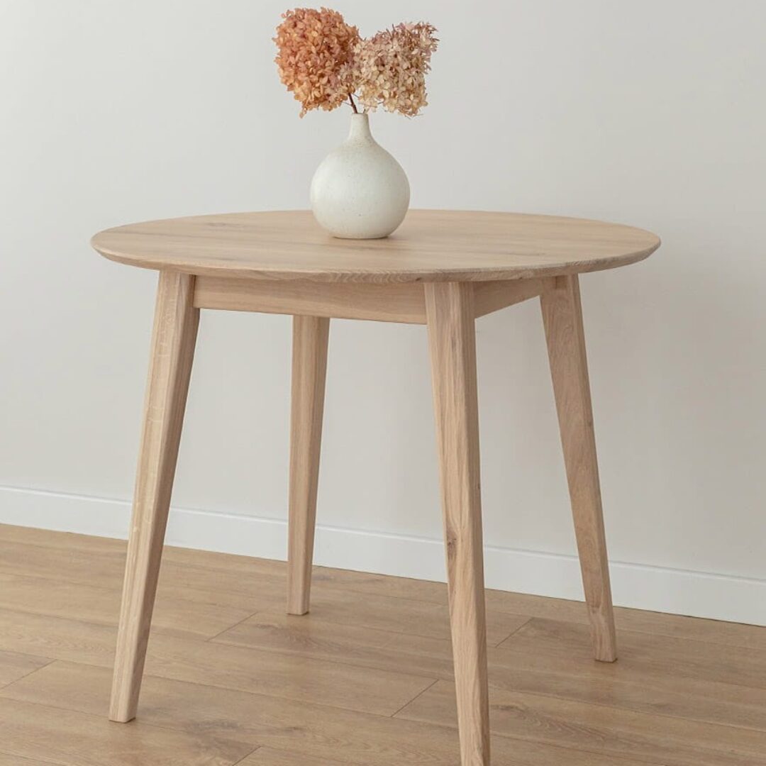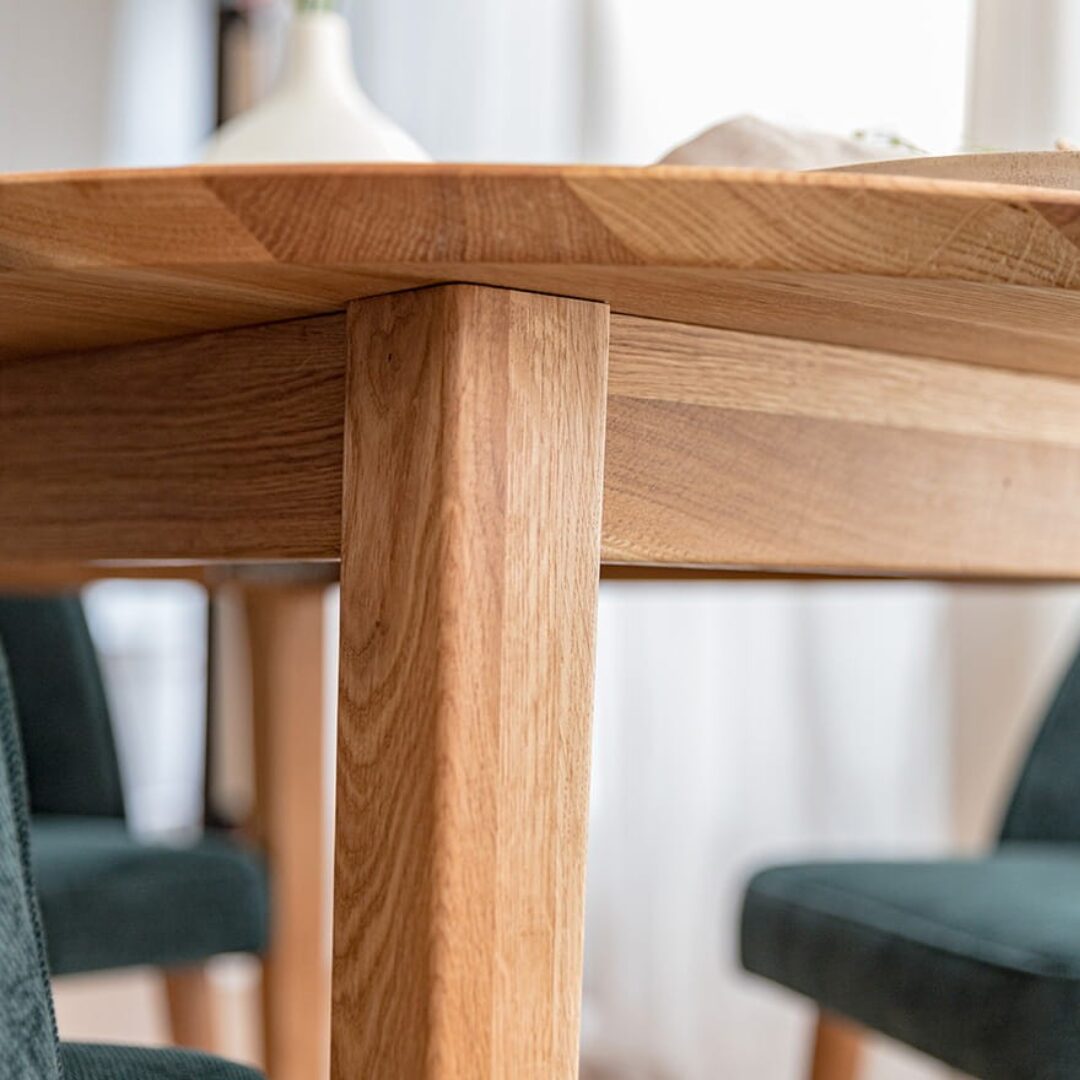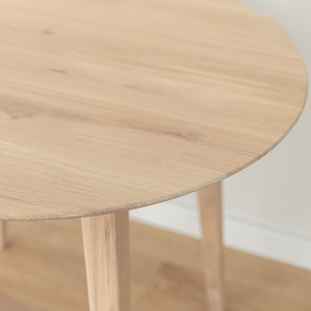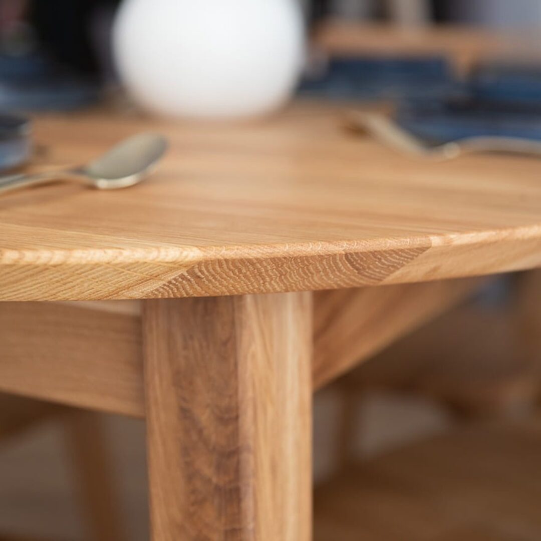 Lunden ümmargune tammepuidust söögilaud ühendab naturaalse materjali, minimalistliku disaini ja praktilise vormi.