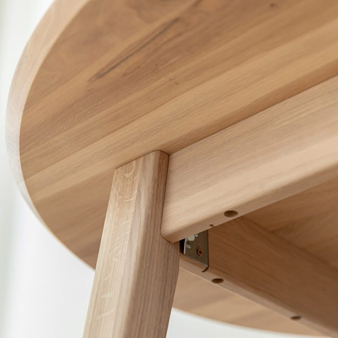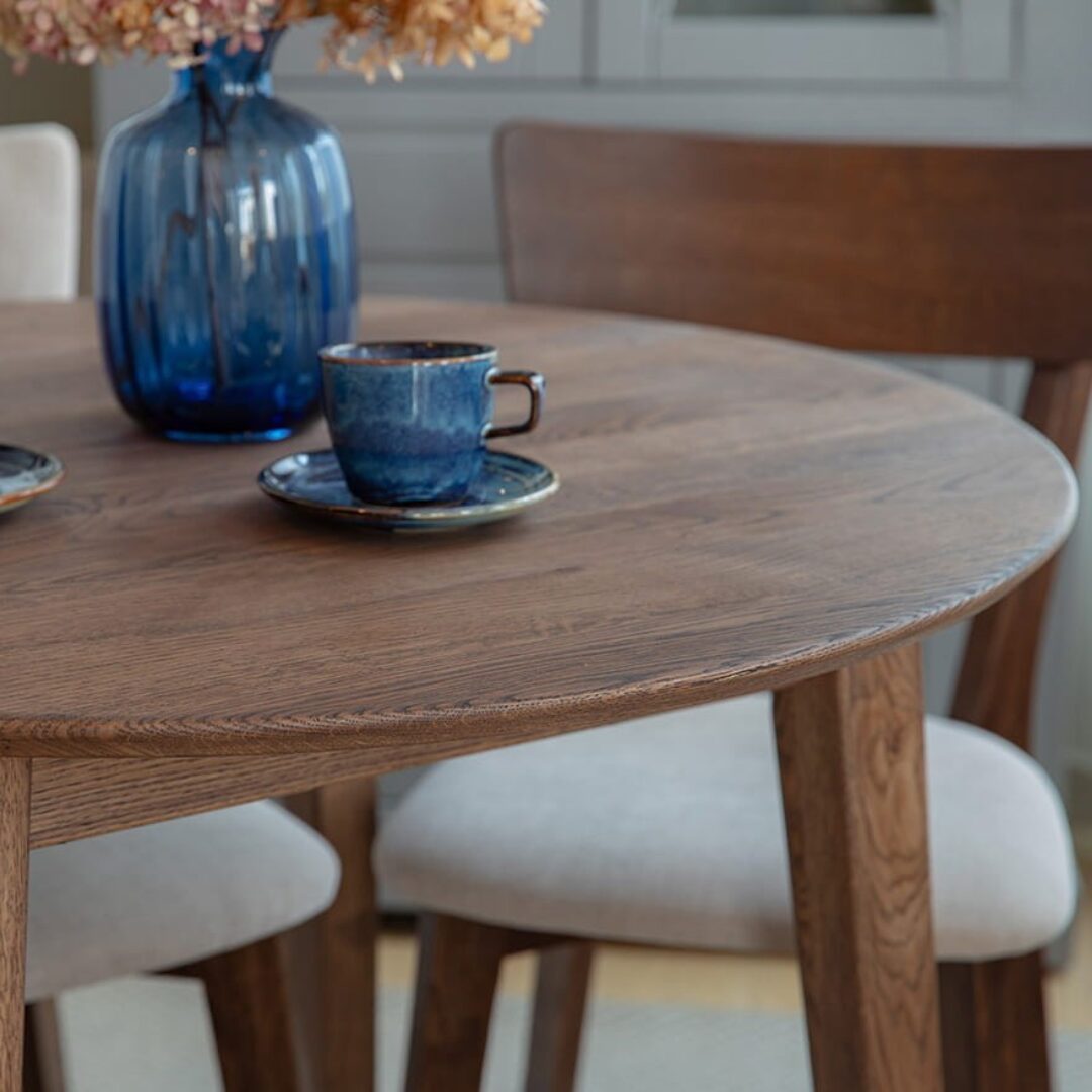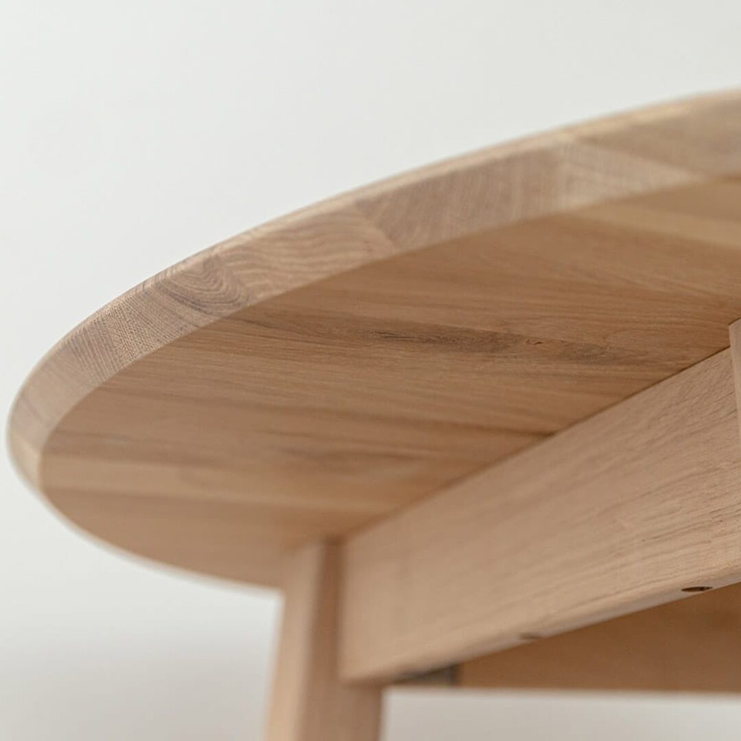 Lunden ümmargune tammepuidust söögilaud ühendab naturaalse materjali, minimalistliku disaini ja praktilise vormi.