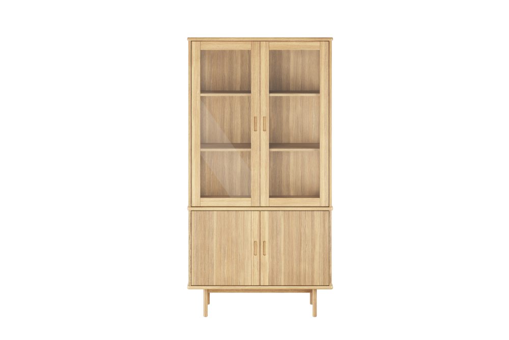 Kapp on valmistatud tammespoonist ning ustesse on freesitud integreeritud käepidemed, mis rõhutavad mööbli puhast ja minimalistlikku joont. Kapil on neli ust – kaks alumist ust on täispuidust soonitud esipaneelidega ning kaks ülemist ust klaasist.