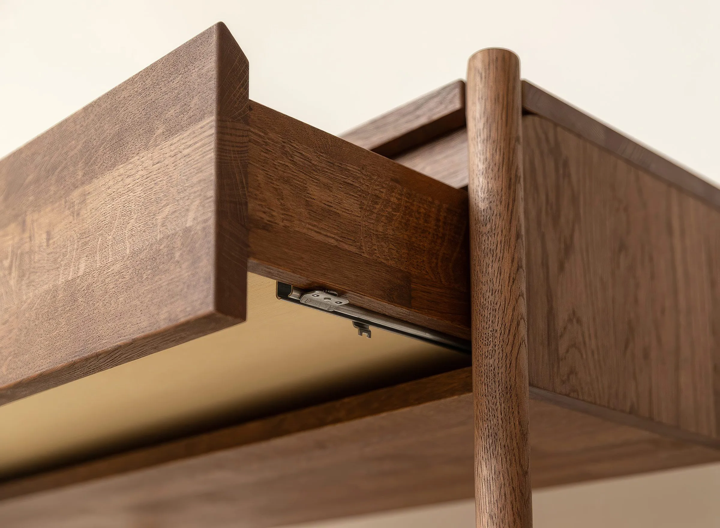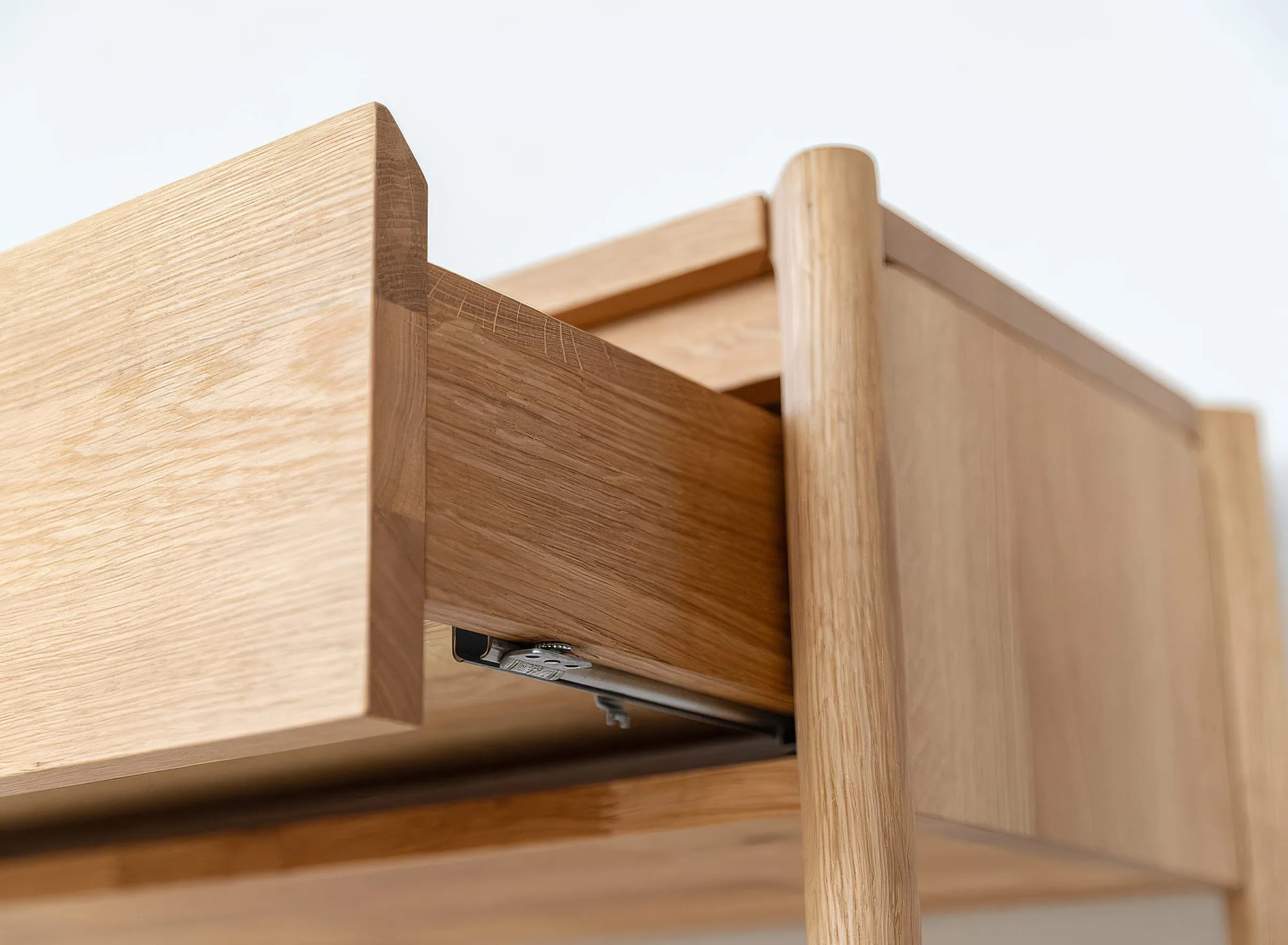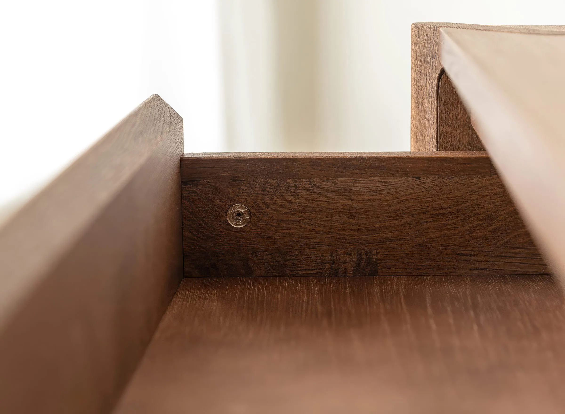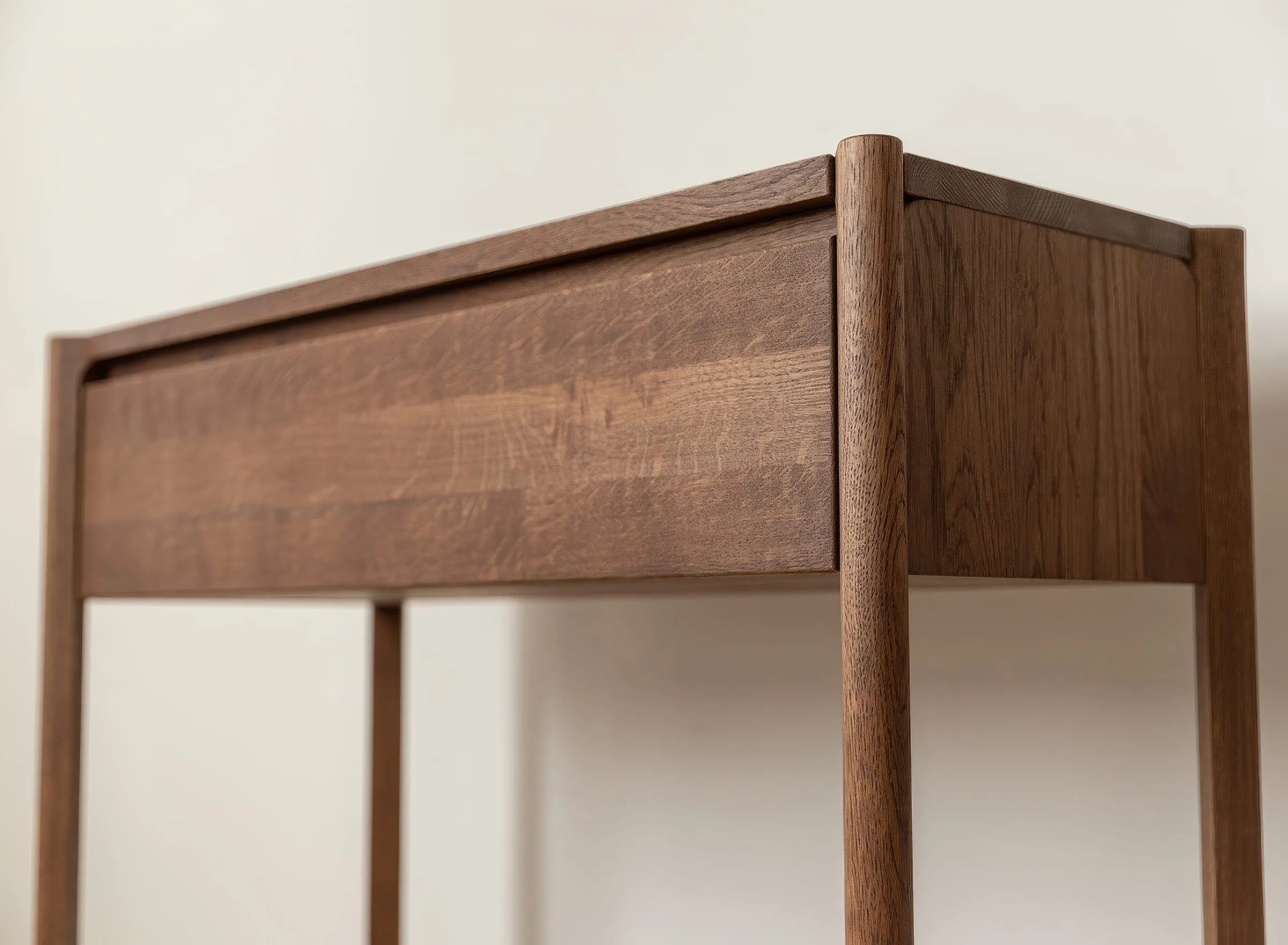 Mööbel on valmistatud täistammepuidust, mis on hinnatud oma tugevuse ja pika kasutusea poolest. Pind on viimistletud õliga, mis toob esile puidu loomuliku süümustri ja kaitseb seda igapäevase kasutuse eest. Minimalistlikku välimust täiendab freesitud käepide, mis on integreeritud sahtli esipaneeli. Sahtel on varustatud vaikse sulgumise mehhanismiga, mis tagab sujuva ja mugava kasutamise.