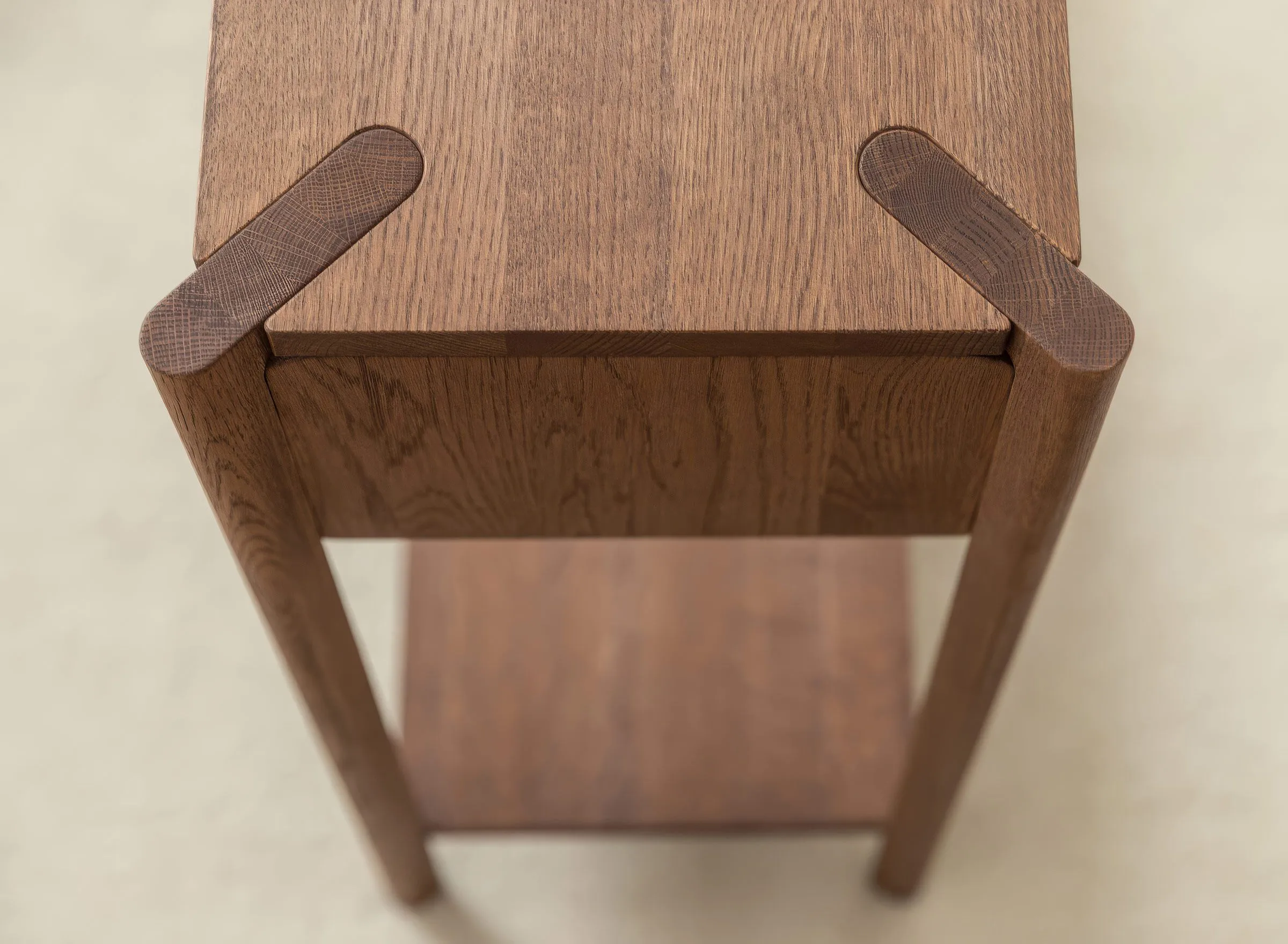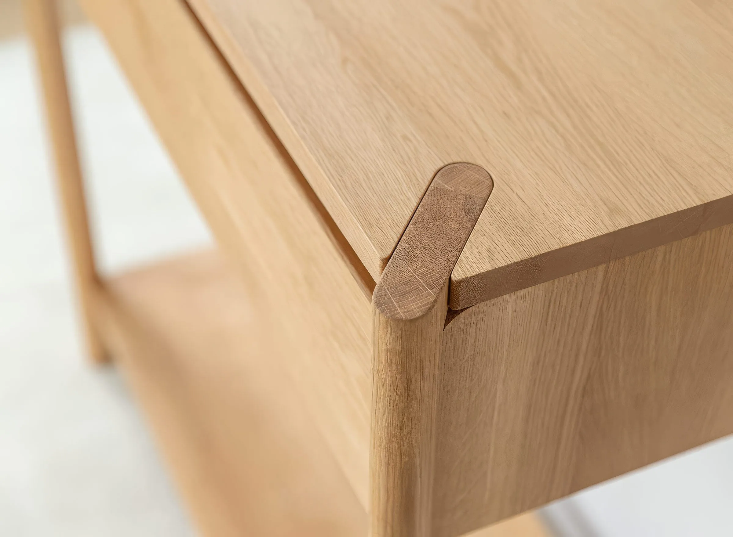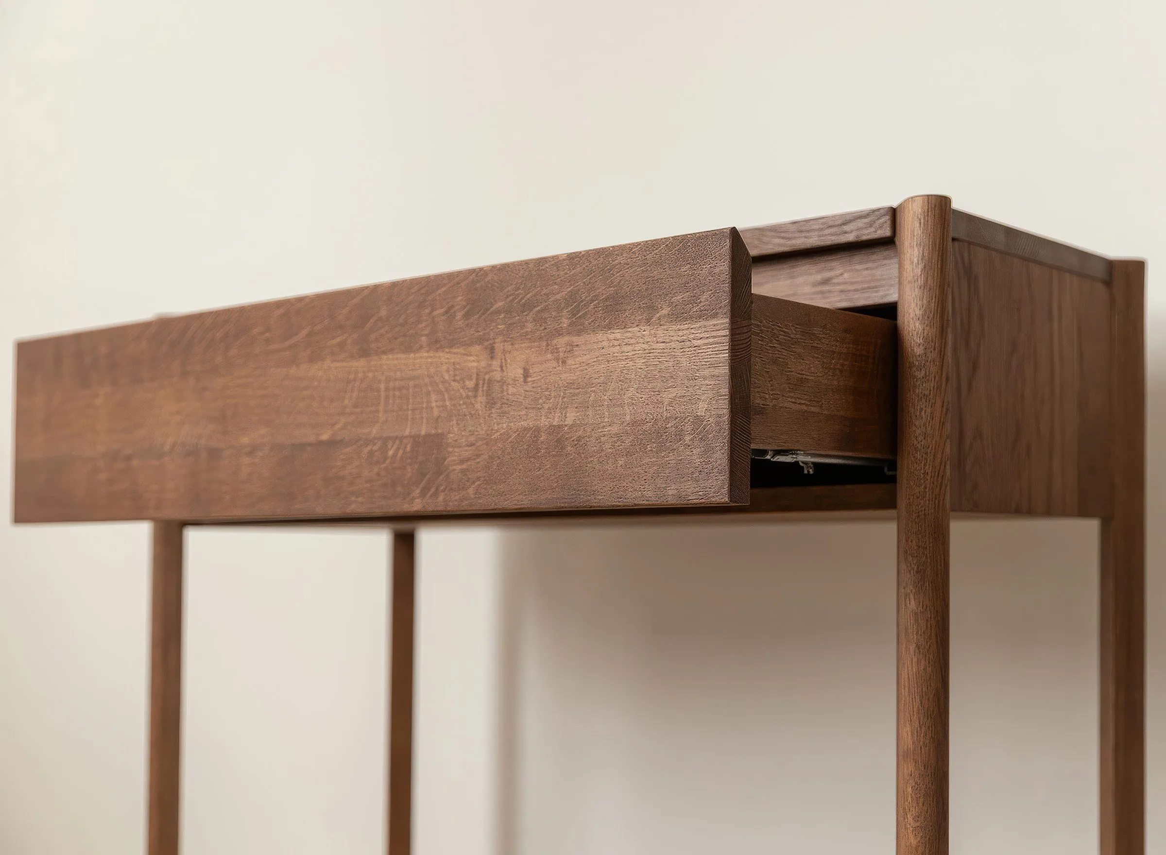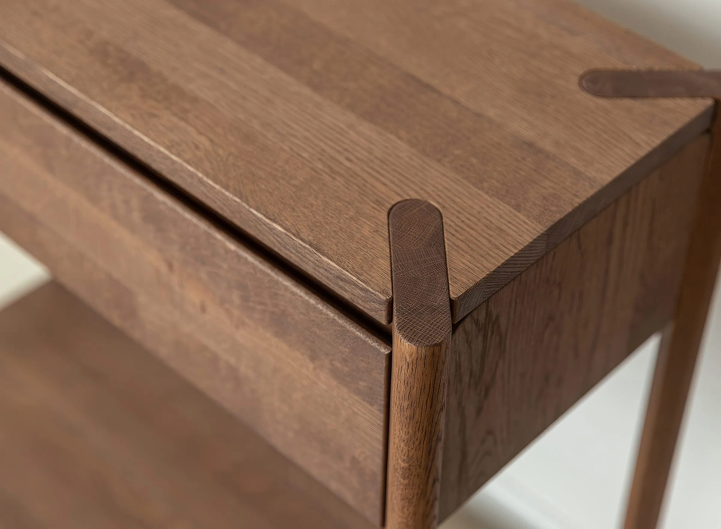 Mööbel on valmistatud täistammepuidust, mis on hinnatud oma tugevuse ja pika kasutusea poolest. Pind on viimistletud õliga, mis toob esile puidu loomuliku süümustri ja kaitseb seda igapäevase kasutuse eest. Minimalistlikku välimust täiendab freesitud käepide, mis on integreeritud sahtli esipaneeli. Sahtel on varustatud vaikse sulgumise mehhanismiga, mis tagab sujuva ja mugava kasutamise.